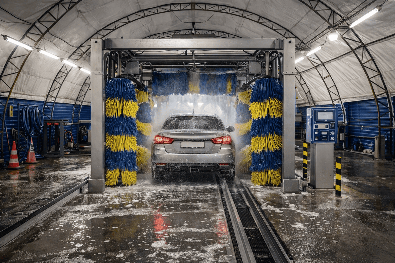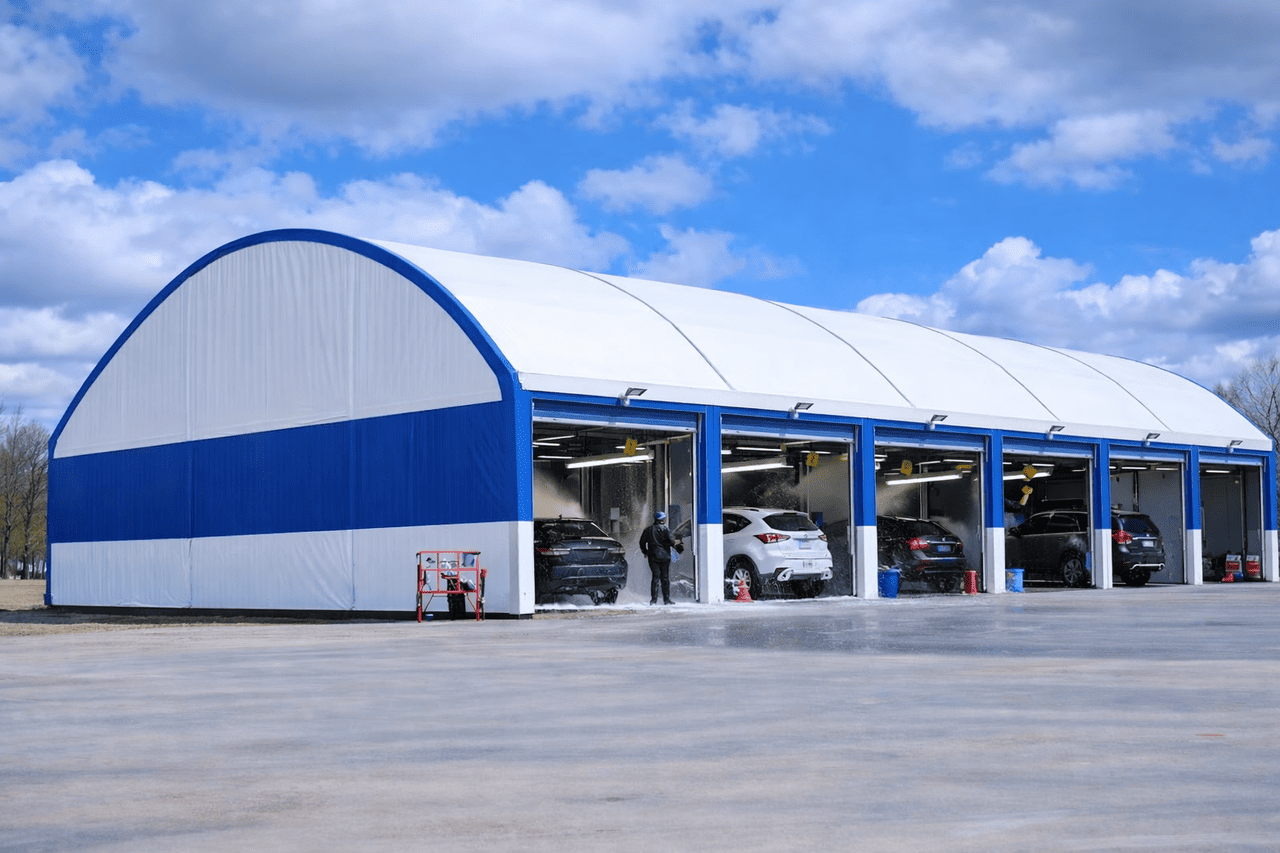 Fabric hangars are an excellent choice for setting up a professional car wash. Vertical sidewalls make it easy to run water and electrical lines neatly, install foam generators, control panels, lighting, and sectional doors. The layout supports a clear “shop” workflow: vehicle entry, wash bays, followed by drying and exit zones, with optional dedicated areas for customer waiting or storage of chemicals and equipment. We particularly recommend this type of structure when you need wide doors, wall-mounted equipment, convenient routing of utilities, and a familiar “box-style” car wash format with a clear and predictable process.